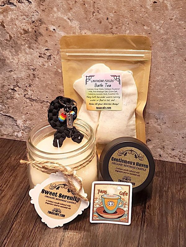 Send the perfect gift by browsing our variety of pieces. A lightly scented candle (or one with no scent at all), with a moisturizing beauty bar, soothing aqua bomb, or cotton canvas tote beautifully packaged and mailed by TWAS Cafe. Thank you for supporting our small business.